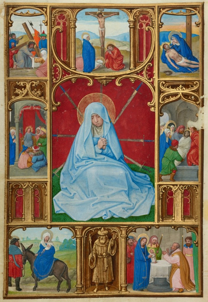 Simon Bening. The Seven Sorrows of the Virgin, from Prayer Book of Cardinal Albrecht of Brandenbur (about 1525-1530) Tempera colors, gold paint, and gold leaf on parchment, Getty Museum