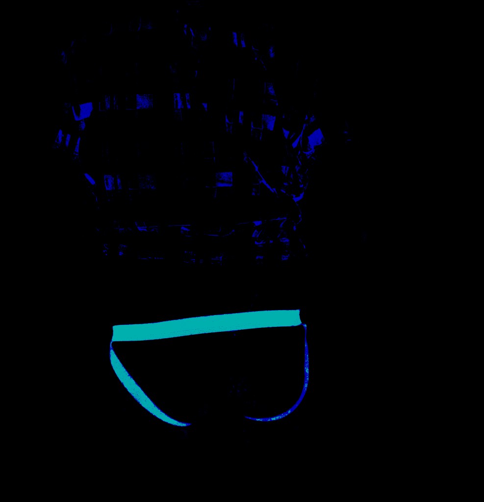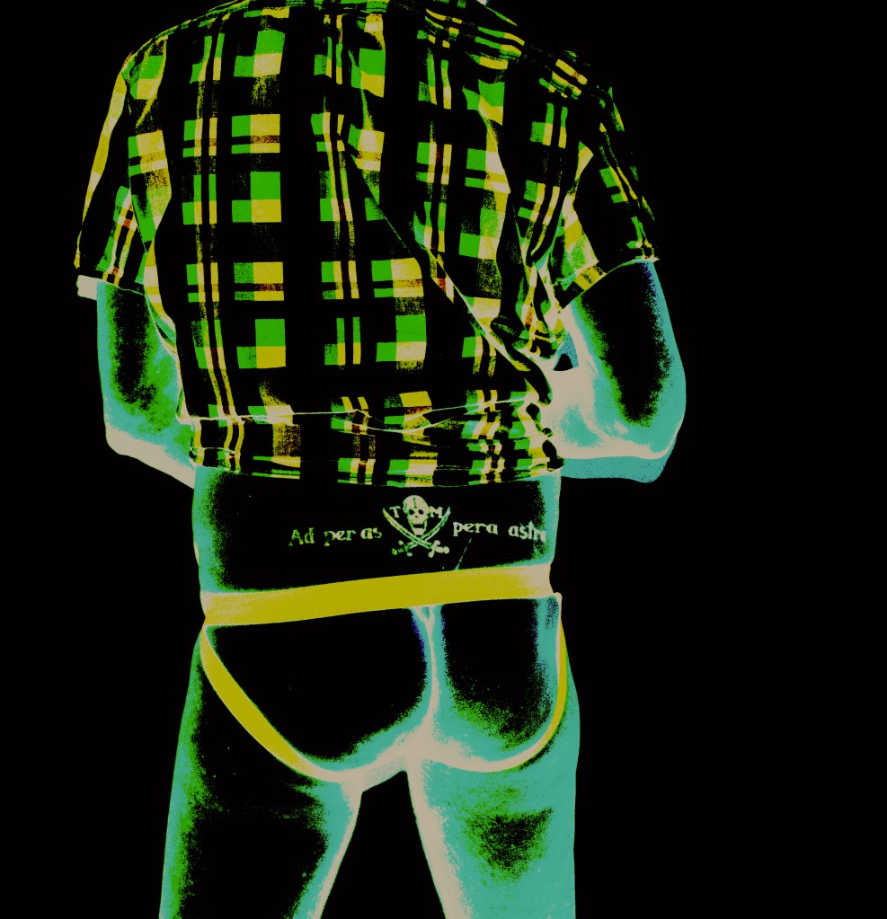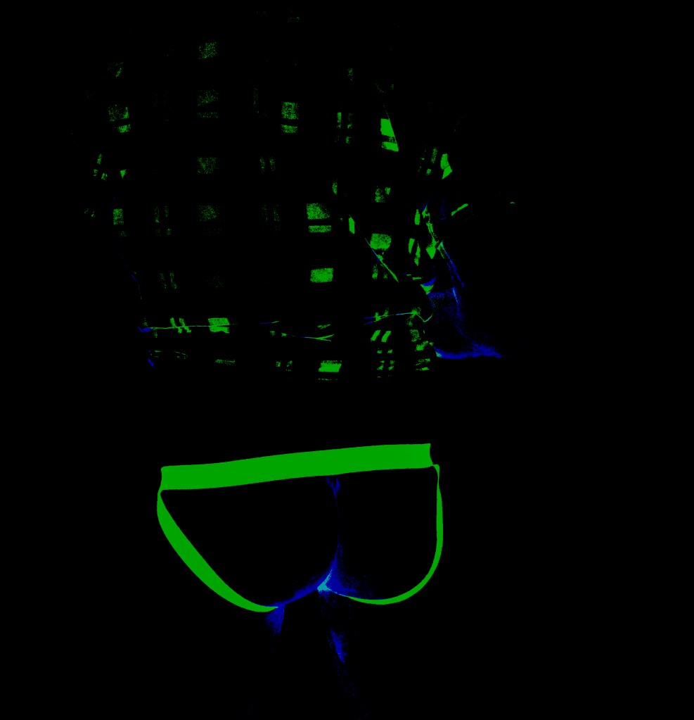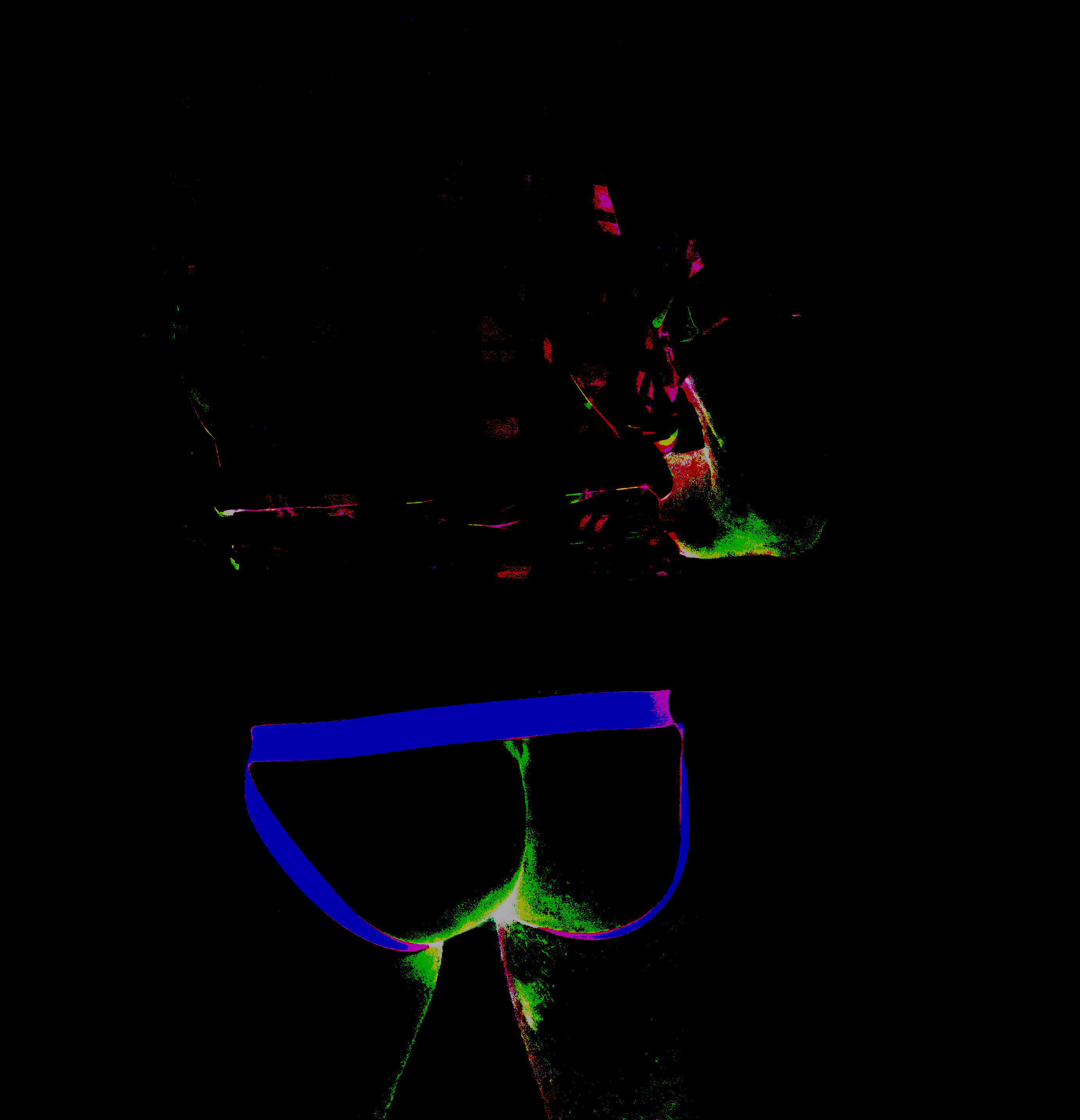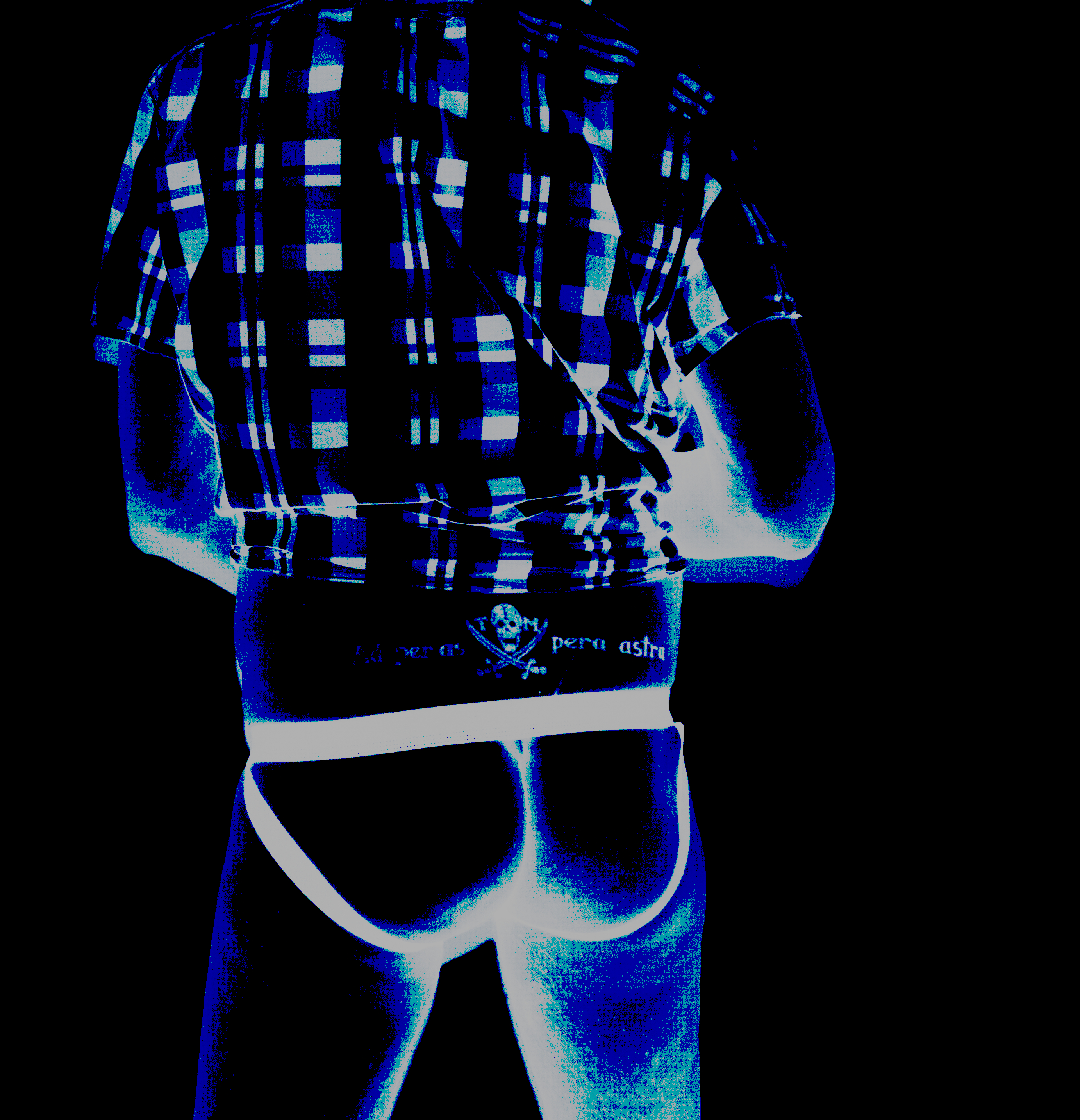 In queer sexual culture the jock strap is more than an erotic garment. It is a uniform worn by a bottom to indicate sexual submission, as well as a symbol of straight heterosexual sports culture adapted and retrofitted to queer sex. I have long had an obsession with jockstraps as the symbolic interplay between submission and dominance. Here I play with exposure and colour saturation to present several different versions of the same shot.