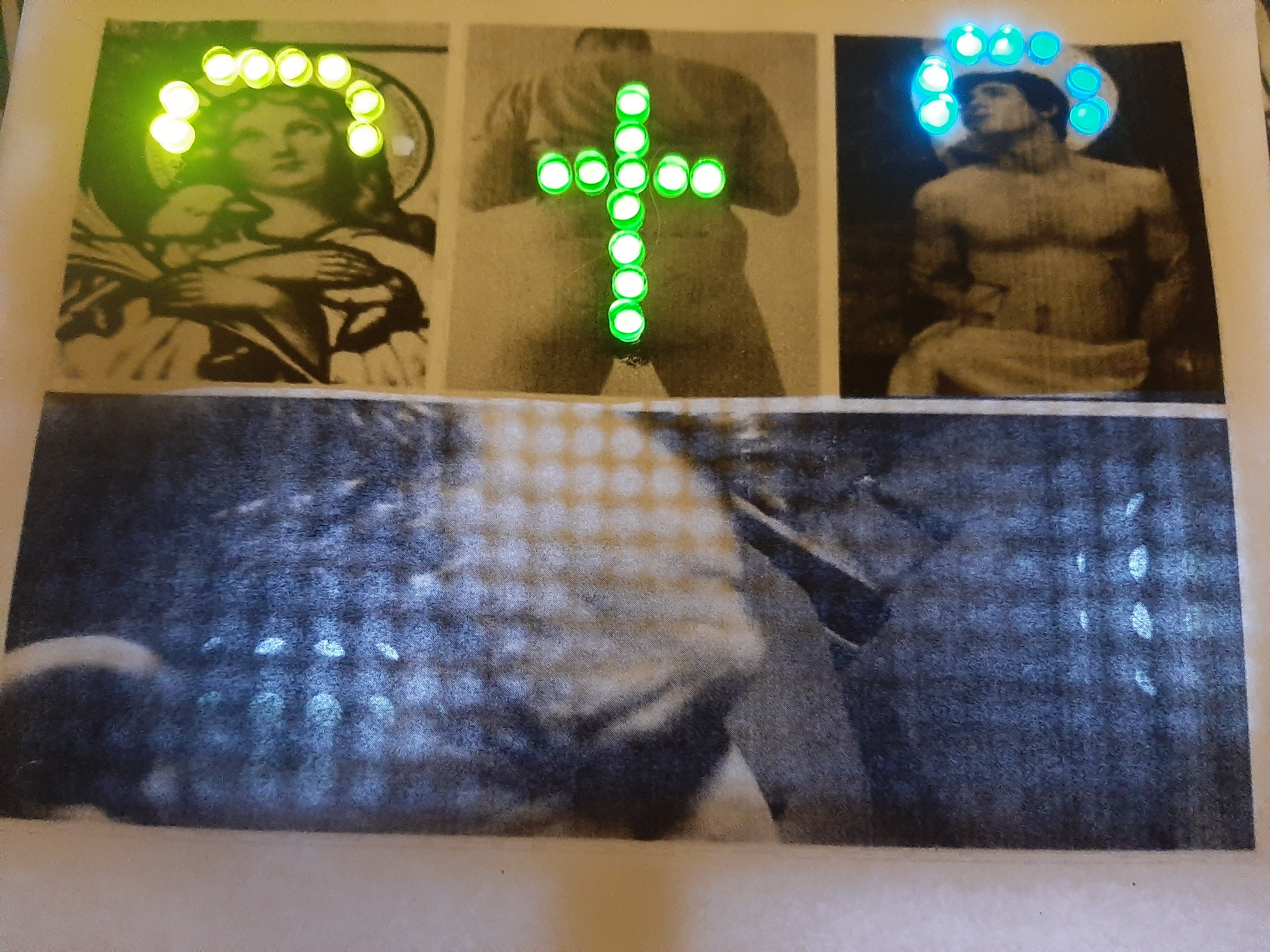 This mural below was created over a period of months with block photos and photographs on paper and laminate which were then taped to the wall. The entire mural was about twelve feet high and seven feet wide. It was meant to be the culmination of the other nudes exhibited here, and some of the photographs and art included above can be seen in the mural as well. It is entitled The Passion of Shawn Holbrook. The Passion in reference to the passion of christ and the passion of Saint Sebastian, murdered by a Roman guard because he would not have sex with him. Shawn Holbrook was the name of my alter ego when I was in California.